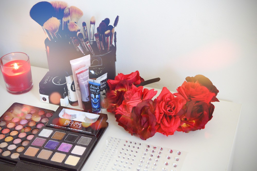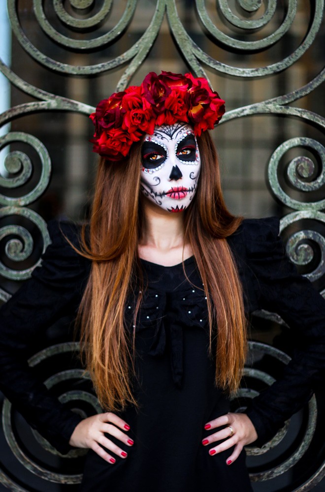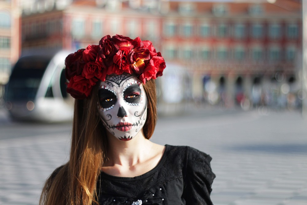 Creative photo shoot taken outside into the city! This is how the story of this Halloween makeup starts. Two weeks ago I had the chance to do a creepy face paint on beautiful model Bianca, who bravely accepted the challenge to walk by in Nice, South of France wearing this makeup in day light, too. The look was completed with shiny jewels and a huge roses flower crown. The Sugar Skull or “Santa del Muerte” Makeup has its roots in ancient Mexican traditions and it was adapted in other continents for the spooky night of October 31.